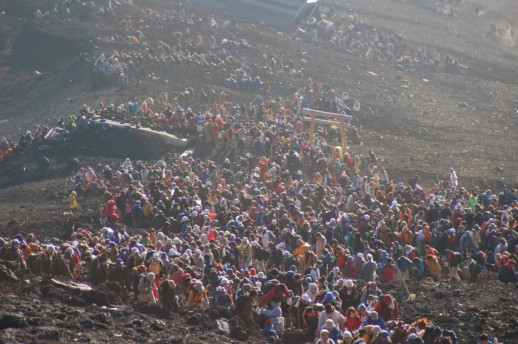 About midnight all progress ground to a halt because of the crowds, at times I would wait for 10 to 15 minutes just to take a step forward, the whole while the person behind me would be pressed into my pack, and I would be pressed into the person in front of me by the crowds. There were a couple of things that caused the slow down. First thing there was A TON of people on the mountain, many thousands (you’ll see the daylight photos of this further down). The crowds were especially bad this weekend because it had rained during most of July, making the mountain un-climbable during the first half of the season, so two months worth of climbers were forced to climb in one month (August). The second issue, is that above 10,000 altitude sickness started to really get to people, if someone got sick or passed out on the trail at a point where only one person at a time can walk the whole line of climbers would stop.